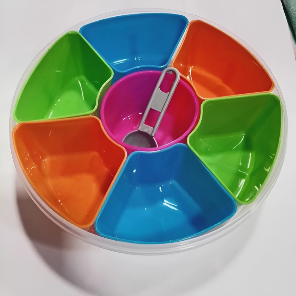 Make snack time stylish and organized with this 7-section plastic snack serving tray. Designed with six outer compartments and one center bowl, this tray is perfect for serving dry fruits, namkeen, sweets, candies, snacks, salads, and chutneys.